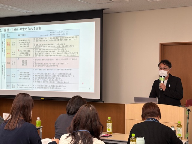 今回の研修では、管理者が明日から実践できる具体的なテクニックを藤田が解説しました。